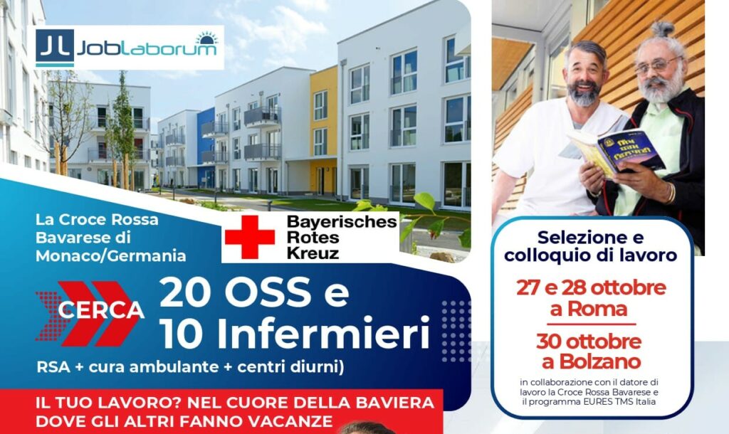 Joblaborum, in collaborazione con EURES TMS e per conto del Bayerisches Rotes Kreuz (Croce Rossa Bavarese), organizza un grande evento di reclutamento dedicato a 20 OSS (Operatori Socio Sanitari) e 10 Infermieri per le strutture RSA, Daycare e cura ambulante nel cuore della Baviera in Germania. 📍 Sedi della selezione: Roma e Bolzano 📅 Date: […]